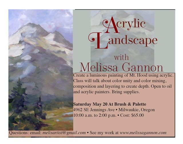 Create a luminous painting of Mt. Hood using acrylic. Class will talk about color unity and color mixing, composition, and layering to create depth. Open to oil and acrylic painters. Bring supplies. Learn more >>