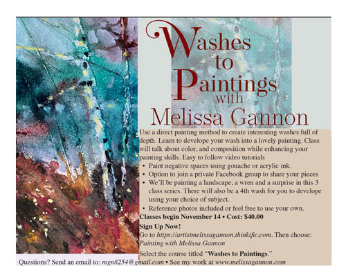 Jude Welter is teaching one day, semi-private workshops  from her studio in 2025! The schedule covers January through May. Space is limited to just 4 students, so please request a workshop flier from Jude at this email     welterjude@gmail.com. All workshops are using watercolors at this time but might open up to oils and acrylics at a later date. Website is www.judewelterstudios.com if you’d like to see Jude’s watercolor style.