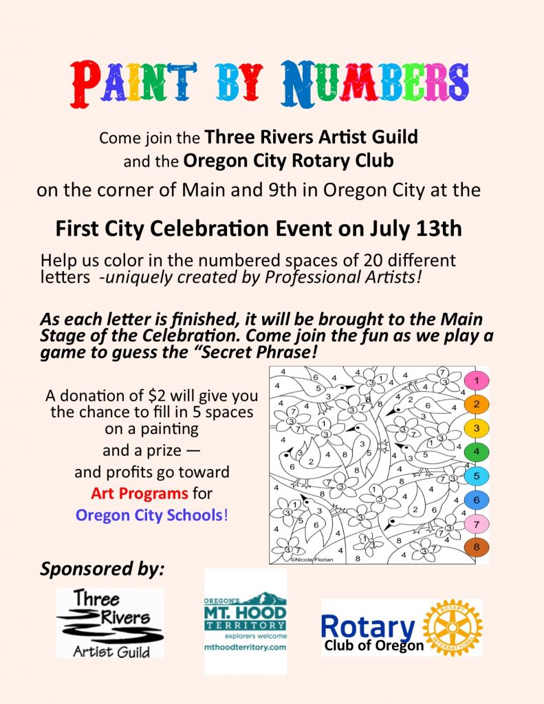 A dozen local artists will involve community members in a shared paint-by-number experience during the First City Celebration on July 13th from 11am-6:00pm. The project, sponsored by the Three Rivers Artist Guild with grants from the Mt Hood Territories Cultural Partnership Program and the Oregon City Rotary Club, will celebrate Oregon City and the arts. Money raised will be donated to Oregon City Schools to benefit art programs.