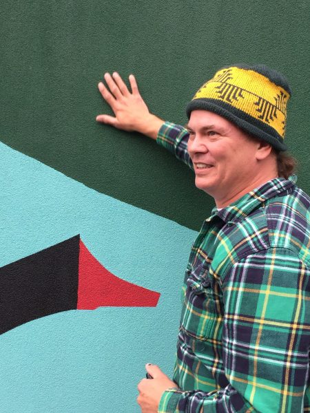On Saturday, October 29, Indigenous artist, Brian Krehbiel of the Confederated Tribes of the Grand Ronde, signed the mural “Reflections of the Falls”. It tells the story of how Coyote and Meadowlark created the Willamette Falls. The mural is an interactive piece that can allow the viewer to be a part of the mural. The artist is supplying a canoe paddle so someone can go into the bookstore and look like they are paddling the canoe through the window.