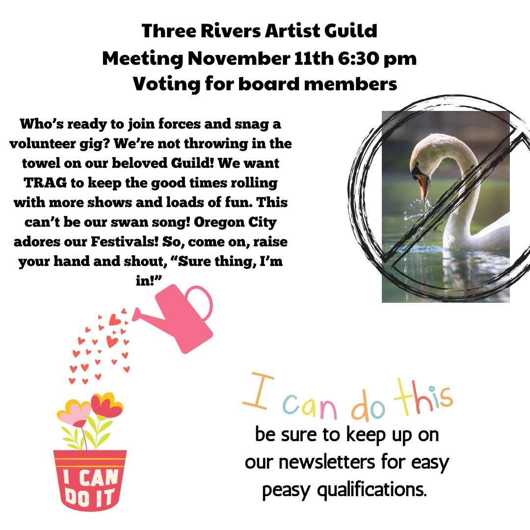 Incoming board chair of the Oregon City Chamber of Commerce, Matthew Broderick will be presenting information about the upcoming local redevelopment campaigns around the old courthouse and the elevator plaza.  These projects could hold some potential opportunities for TRAG and our member artists.  This is your chance to share what you would most like to see happen in these spaces.