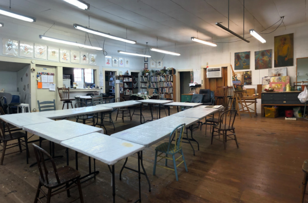 Lynda Orzen and I met with the Co-Presidents of Brush and Palette studio. Most of you have probably passed this quaint, vintage barn-like building on Jennings and McLoughlin. Inside is a bright, warm and cozy studio that is quite large.