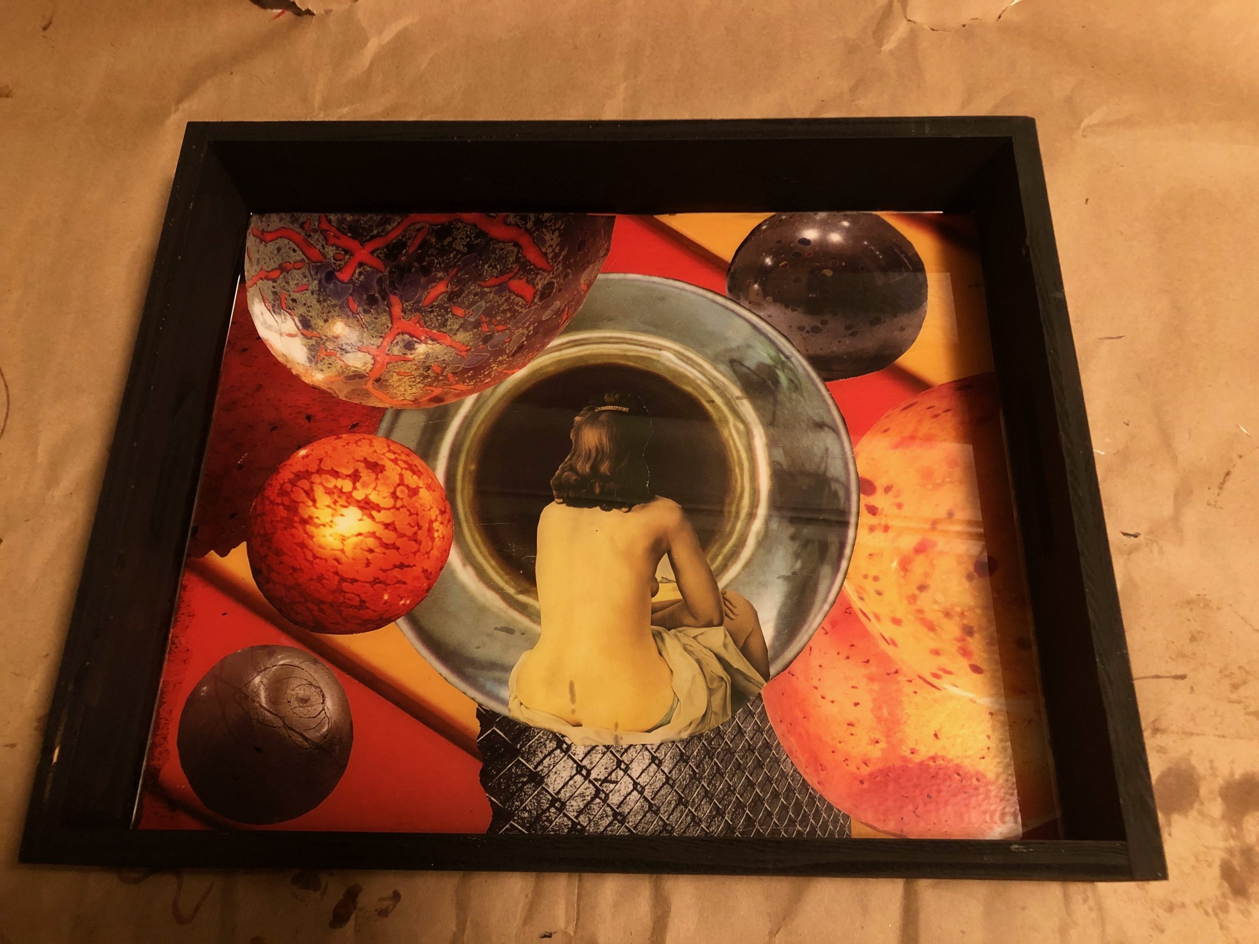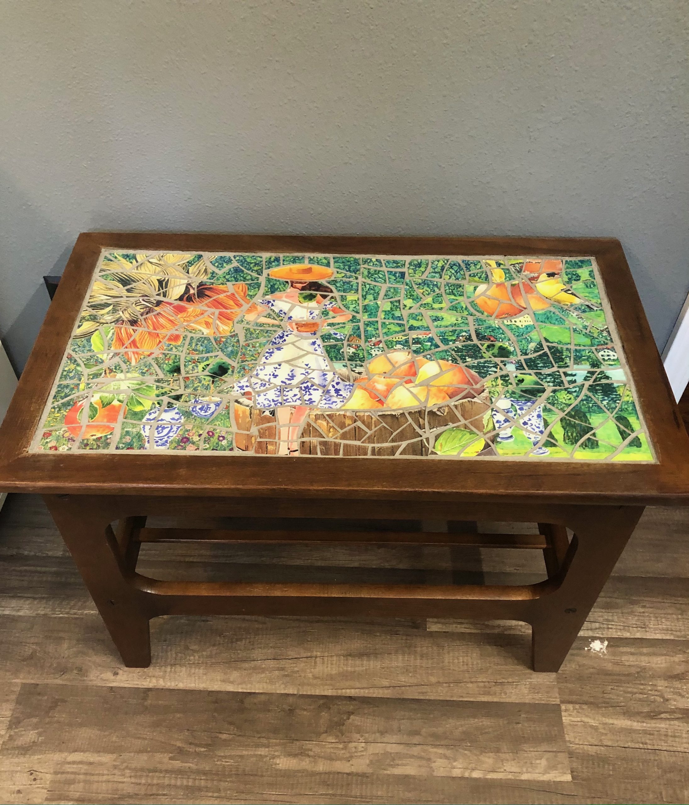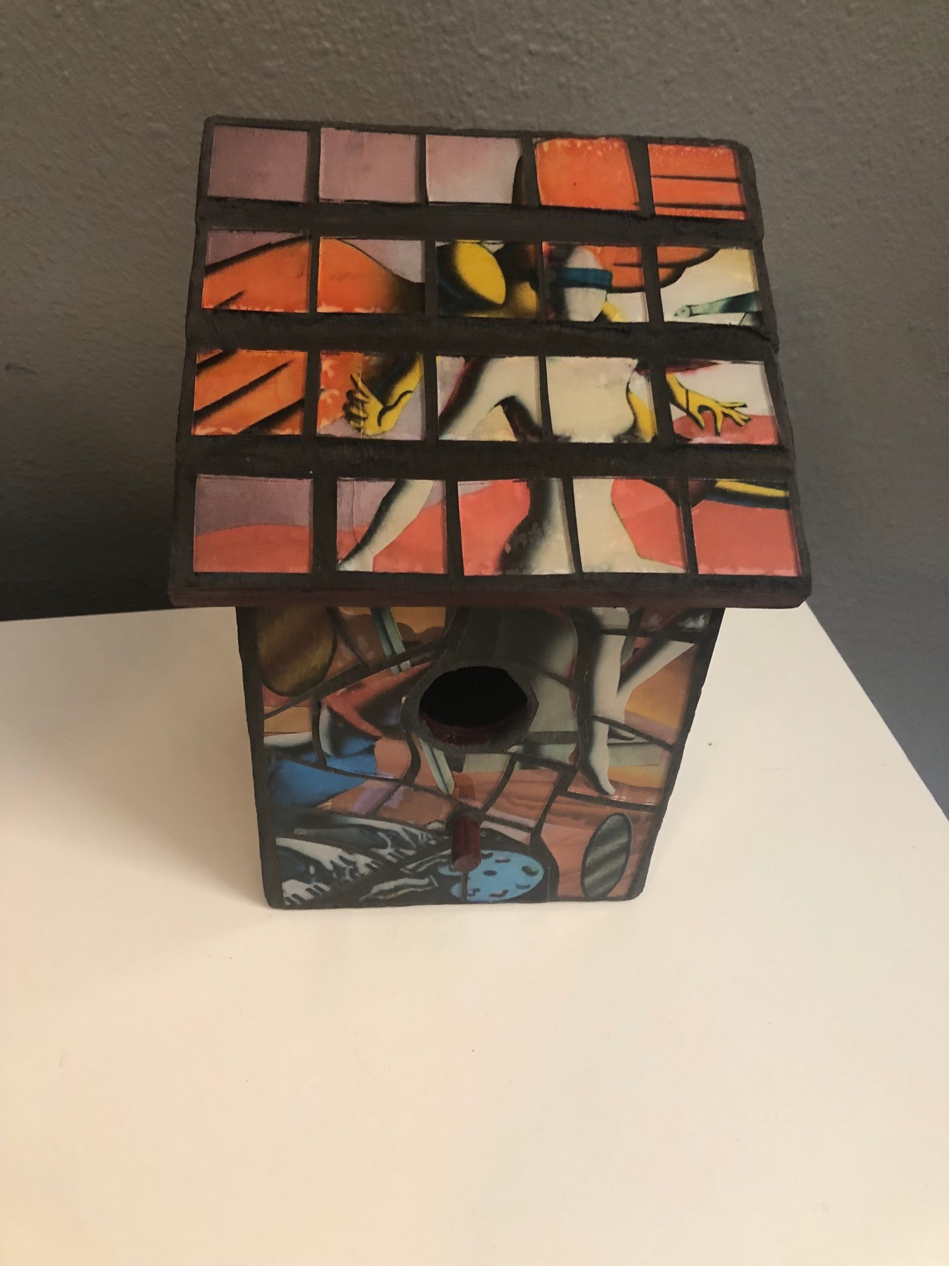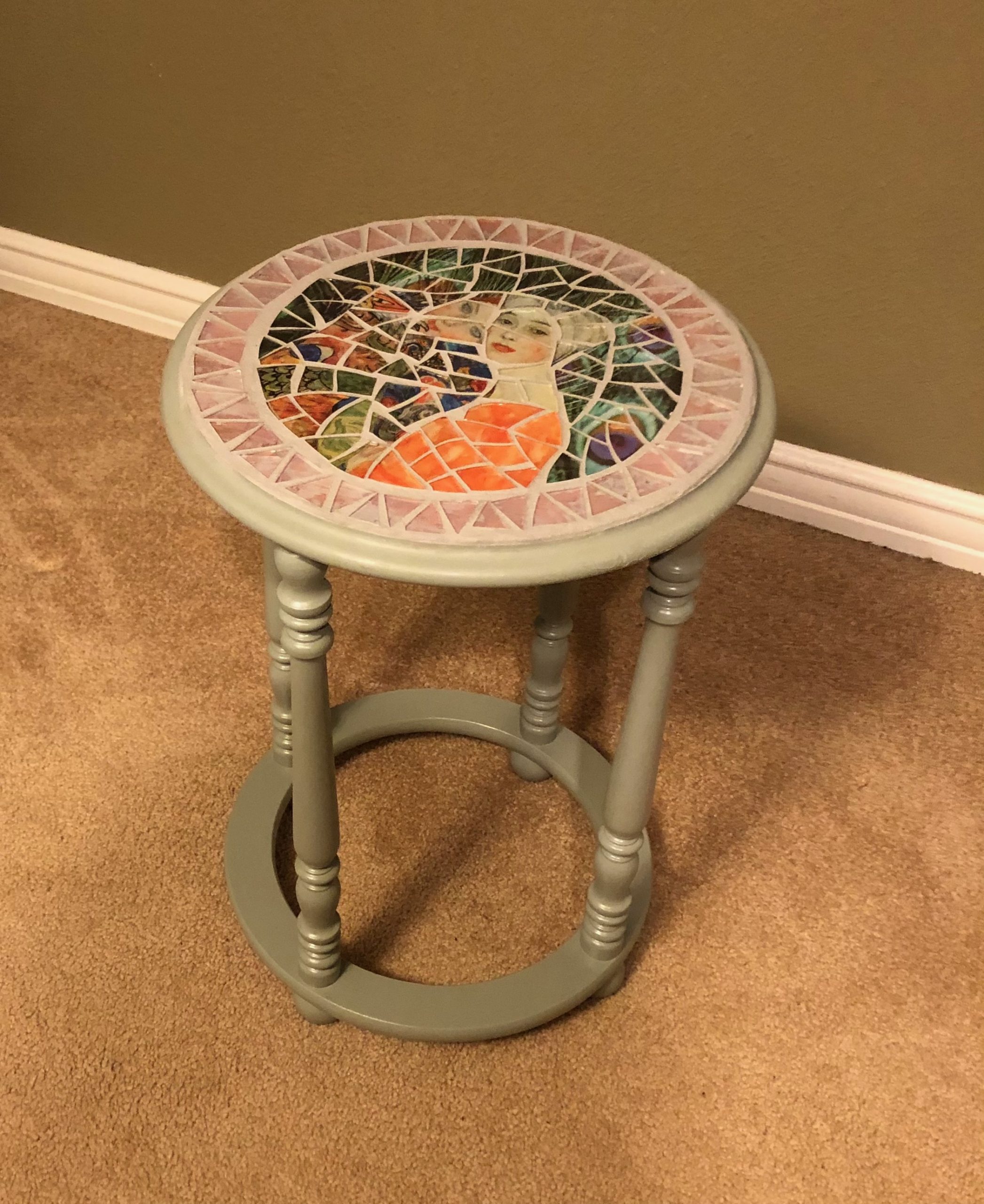 The joy is in the process. I love the hunt for materials. They can come from anywhere, garage sales, a friends basement, thrift stores, just to name a few. I have spent hours at Powell’s looking through art books. I use art from some of my favorite artists such as Chagall, Klimt, Dali and Kostabi in my work. The moment when an idea presents itself is magical. The actual process of creating is very much a letting go experience since the finished product rarely resembles the original thought. Last but definitely not least is the grouting process; I call this “the unveiling”. I never really know what a piece will look like until all the excess grout is wiped away.